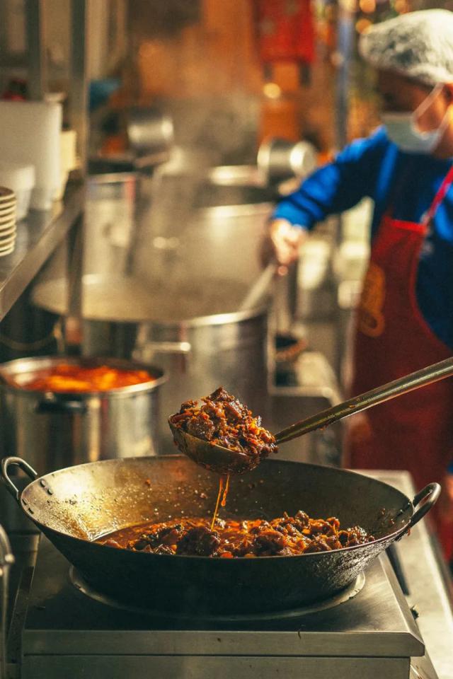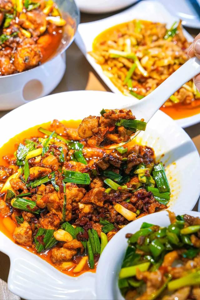 到贵阳城北,阳朗辣子鸡转为猛火爆炒。鸡肉先炒干,再经高压锅压熟,灵魂调料糍粑辣椒再次登场,爆炒出香气,鸡肉回锅历经"三翻九转",这盘辣子鸡裹满辣椒和香料的滋味,又耙又糯,是一记"色香味"的组合重拳。
