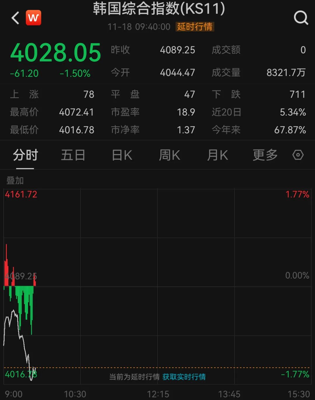 11月18日(周二)国内正规配资平台,日韩股市开盘大跌。