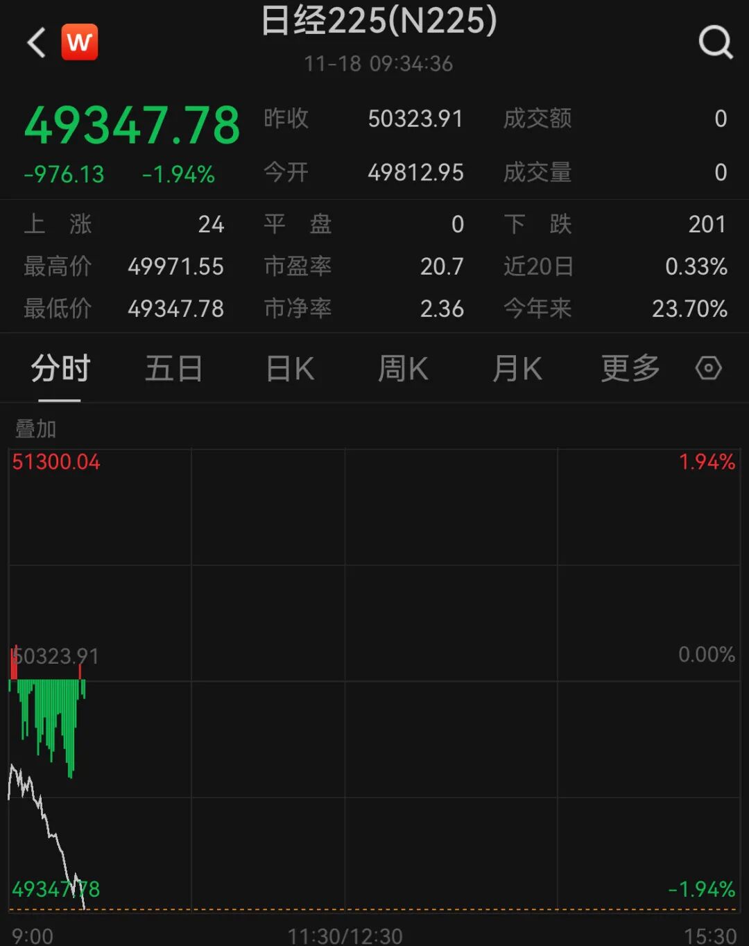 截至发稿,日经225指数下跌1.94%至49347.78点。